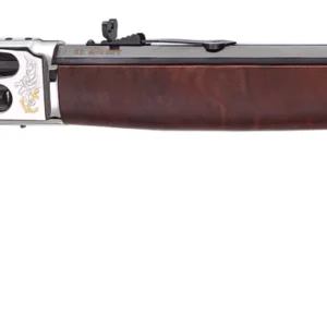 For those who want both power and presence the .45-70 Government version pairs a historic cartridge with fine artistry making it the crown jewel of this tribute series. The receiver is milled from a solid piece of hardened brass plated in nickel and engraved with 24K gold highlights on both sides. For an additional upgrade in elegance weve selected Semi-Fancy grade American Walnut for the stocks which are capped off with a polished brass buttplate and forearm cap. – Engraving Highlights: – Right Side Receiver: An eagle and anchor in 24K gold surrounds the words In the Air On Land And Sea. – Left Side Receiver: Celebrating 250 Years and the years 1775-2025 are engraved with a globe in the background. – Buttstock: In an abstract tribute to brotherhood and camaraderie a crowd of hands hoists the flag of the United States of America in a show of resilience and patriotism. – Model Number H010BGMC – Action Type Lever Action – Caliber .45-70 Gov’t – Capacity 4 Rounds – Barrel Length 22 – Barrel Type Octagon Blued Steel – Rate of Twist 1:20 – Overall Length 41.1 – Weight 8.10 lbs. – Receiver Finish Polished Nickel Plated – Rear Sight Fully Adj. Semi-Buckhorn w/ Diamond Insert – Front Sight Brass Bead – Scopeability Drilled and Tapped – Scope Mount Type Weaver 63B – Stock Material American Walnut – Buttplate/Pad Brass – Length of Pull 14 – Safety Transfer Bar – Best Uses Target/Collector – Embellishments/Extras Receiver engraving with 24kt gold plated highlights. Engraved painted buttstock.