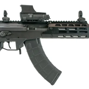 Action: Semi Auto – Caliber: 7.62x39mm – Capacity: 30 – Finish: Black – Sights: Adjustable – Twist: 1:9.45 – Barrel Length: 8.3 – Overall Length: 18 – Weight: 6 lb – Charging handle (reciprocating) moved to the left side of the milled steel receiver allowing for weak hand operation – Weight reduction with the use of modern polymers – AKM/AK-47 magazine compatibility – Full length 2-piece Picatinny top rail – Picatinny tri-rail forearm with built in slide on/off rail covers with pressure switch access – Fully adjustable iron sights with Tritium front post
