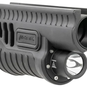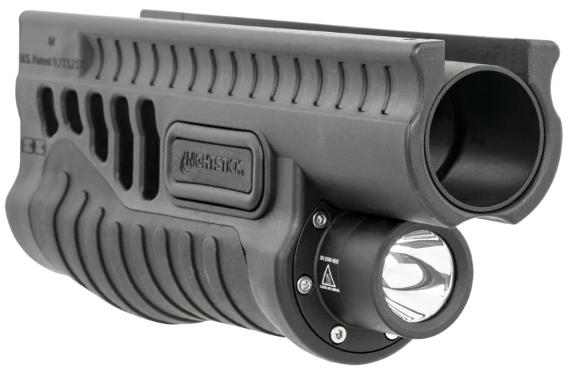 The SFL-11WL shotgun forend weapon light is a complete forend replacement for your 12 gauge Mossberg 500/590/590A1 or Shockwave pump-action shotgun. Built from a one-piece body of heavy-duty glass-filled nylon with an over-molded rubber grip area, it features a super-bright LED rated at 1200 lumens with an hour-and-a-half runtime. Designed around a high-efficiency deep parabolic reflector, the tightly focused beam has a 203-meter beam distance.The SFL forend features ambidextrous switches positioned intuitively towards the front for easy activation. Both buttons are surrounded by a small raised bump guard that helps prevent accidental activation while racking the action or laying it on its side. The light also features an ergonomic palm swell design to improve grip during light activation and weapon manipulation under stress. Each SFL comes with an optional hand stop/safety strap and Nightstick’s SFL action tube nut wrench for removal of factory-installed castle nut and pump handle fore-end. Comes with two CR123 batteries, but can be upgraded to li-ion rechargeable with an optional 18650-KIT. Limited lifetime warranty.