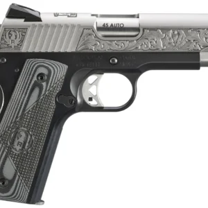 Caliber: 45 Auto – Capacity 7+1 – Slide Material Stainless Steel – Barrel Length 4.25 – Grip Frame Black Anodized – Grip Panels Black/Gray Deluxe Checkered G10 – Model Type Lightweight Commander-Style – Slide Finish Low-Glare Stainless – Width 1.34 – Sights Drift Adjustable Novak® 3-Dot – Weight 29.3 oz. – Overall Length 7.75 – Height 5.45 – Grooves 6 – Twist 1:16 RH – Southport CT Edition model features a finely engraved stainless steel slide including the Ruger logo and bald eagle on the sides with the Ruger logo and One Lacey Place adorned on the top of the slide. – Features a lightweight aluminum frame and polished titanium feed ramp. – Classic original 1911 fire control. – Precision CNC-controlled machining process results in a superior slide-to-frame fit and smooth slide travel. – Positive barrel lock-up allows for superior accuracy out of the box. – Traditional design with replaceable grip panels and checkered backstrap. – Lightweight aluminum skeletonized trigger provides a very crisp no creep light trigger pull with a quick positive reset. – Skeletonized hammer and titanium firing pin for faster lock time. – Oversized beavertail grip safety provides positive function and reliability. – Extended thumb safety and slide stop lever for improved positive manipulation. – Integral plunger tube for slide stop and thumb safety is not staked and will never come loose. – Oversized ejection port and extended magazine release enhance performance. – Inspection port allows for visual confirmation of a loaded or empty chamber. – Features a flat mainspring housing and rear slide serrations for a positive grip. – Accepts most standard aftermarket 1911 parts and accessories. – Also includes: Two 7-round stainless steel magazines; bushing wrench. – Production will be limited to 500 total units.