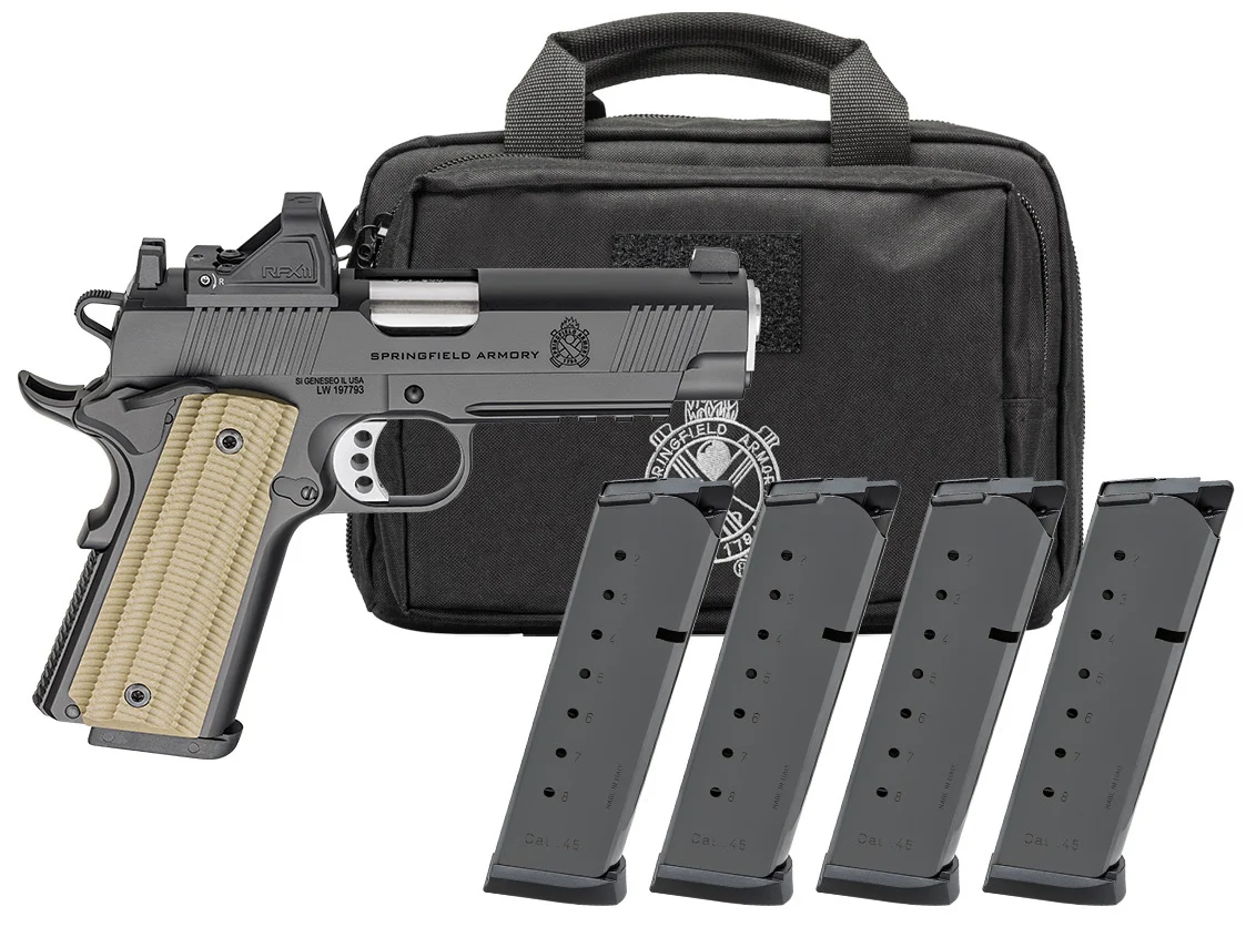 The Operator® 4.25 AOS delivers a .45 ACP concealed carry focused pistol with a host of duty-grade features that serious shooters demand. It includes G10 grips ambidextrous safety two eight-round magazines with bumper pads forward cocking serrations and integral accessory rail making it a must-have tool for self-defense. Enhanced with AOS the Operator now accommodates a wide variety of popular optics including RMR Shield Delta Point Pro and Docter. Each AOS plate integrates a rear sight that offers proper optic height and an intuitive sight picture ensuring visible co-witnessing in nearly all optic configurations. If you want a no-nonsense defensive-grade pistol thats ready to serve look no further than the Operator. – Caliber .45 ACP – Color Black – Barrel 4.25 Forged Stainless Steel Match Grade Fully Supported Ramp 1:16 – Slide Forged Carbon Steel Black Cerakote® Optics-Ready – Frame Forged Aluminum Alloy Black Cerakote® – Sights White-Dot Front Black Serrated Rear Viridian®RFX11 Green Dot – Recoil System Commander Length GI Style – Grips VZ Grips® G10 – Magazines (4) 8-Round – Weight 31 oz – Length 7.9 – Height 5.25