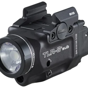 The Streamlight TLR-8 sub produces a narrow beam with optimum peripheral illumination. Featuring next generation rear paddle switches with high and low options; white LED and red aiming laser; safe-off feature prevents accidental activation, saving batteries and rail clamp system securely attaches/detaches quickly and safely with no tools and without putting your hands in front of muzzle. Includes mounting kit with key, CR123A lithium battery and Interchangeable paddle switches easy to swap out with multi-tool.