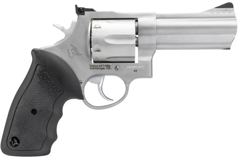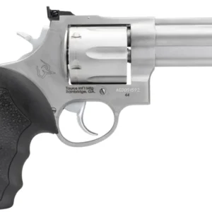 Taurus large frame revolvers delivers the goods in a big way when the chips are down. The model 44 offers up 6 rounds of full-power .44 Magnum loads. Hammer-forged for tough performance and confidence-boosting accuracy, these decision-makers come with hand-fitted actions, and clean, crisp triggers right out of the box. It has a transfer bar safety and the Taurus Security System (TSS). This model 44 features a 4″ ported barrel to reduce muzzle flip and felt-recoil, a fixed front sight and adjustable rear sight. It has a soft black rubber grip and a matte stainless steel metal finish.