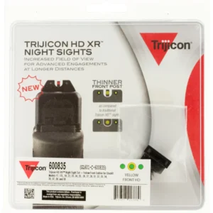 The Trijicon HD XR Night Sights were specifically designed with the ever evolving challenges of law enforcement agencies in mind. Building on the features of the current HD Night Sights, the Trijicon HD XR night sights are for the next level of advanced target identification and engagement at increased distances. A thinner front sight post allows shooters to have a larger field of view which further enhances the ability to identify targets, expedite engagements and see location of hits on target at longer distances. Pistol shooters that need the advantage of a more precise engagement in any light can count on the Trijicon HD XR Night Sights. Green tritium lamps are warranted for 12 years from date of manufacture. Professional installation recommended. Front Sight Width: 0.122″. Front Sight Height: 0.283″. Rear Sight Height: 0.321″.